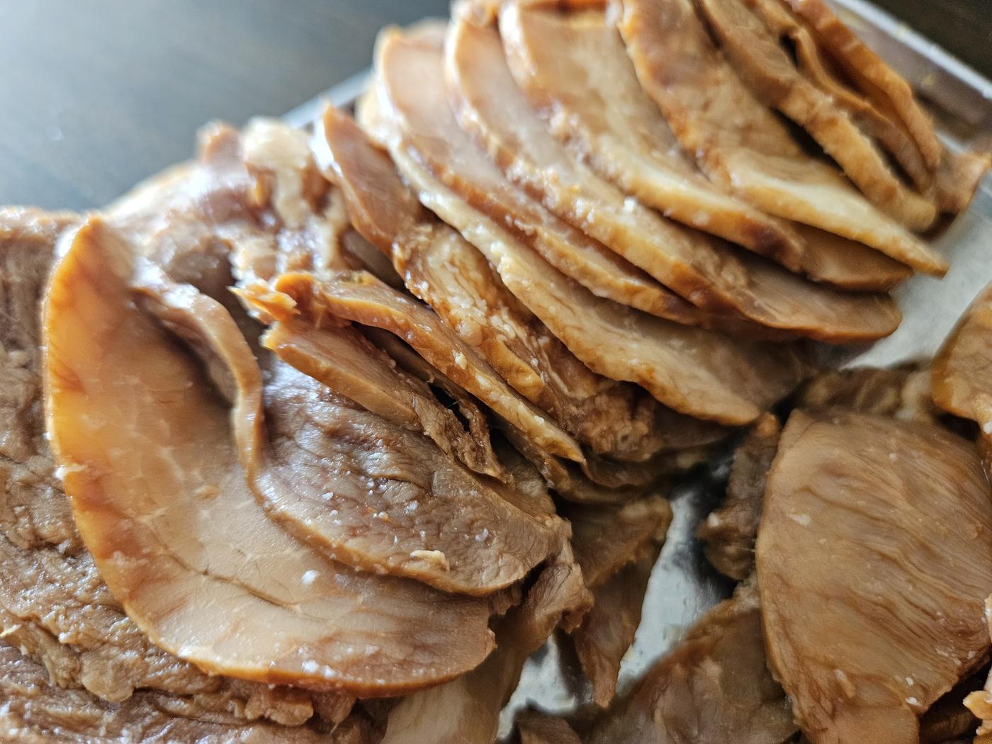 噛み切りやすい柔らかさで食感はハムに近いです。醤油ベースのほんのりと甘じょっぱいタレもしっかりと漬けこまれていて、このままおつまみとして出しても喜ばれそう♪