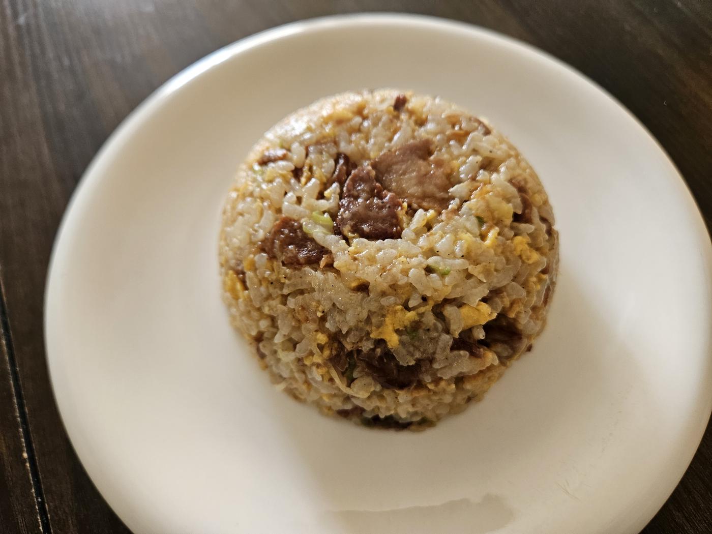 お皿に盛って「チャーシュー入りチャーハン」が完成しました!具材は卵とチャーシューとネギのみ。