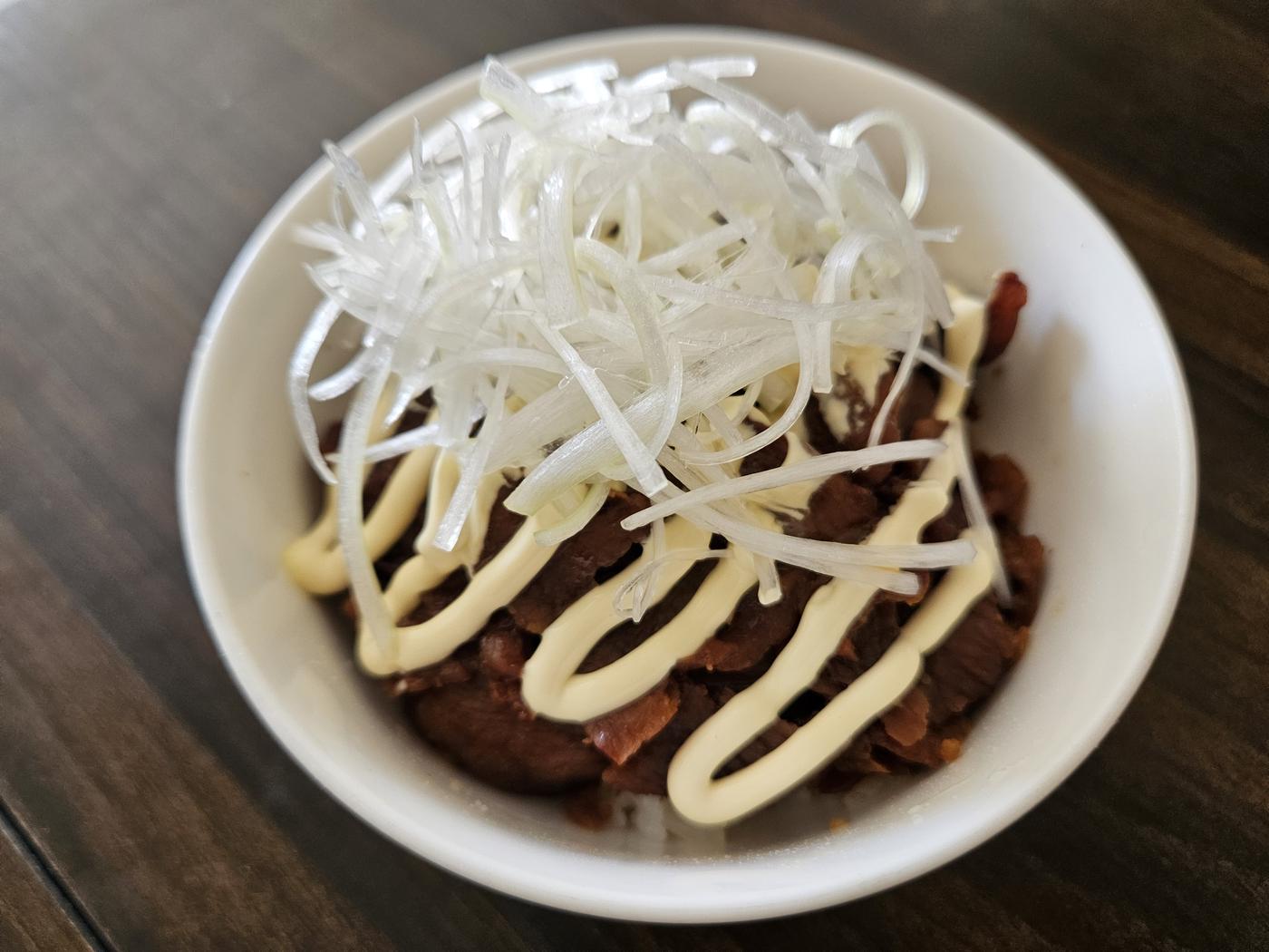 ご飯の上に焼きチャーシューをのせて、マヨネーズと白髪ネギを添えたら「チャーシュー丼」ができました!