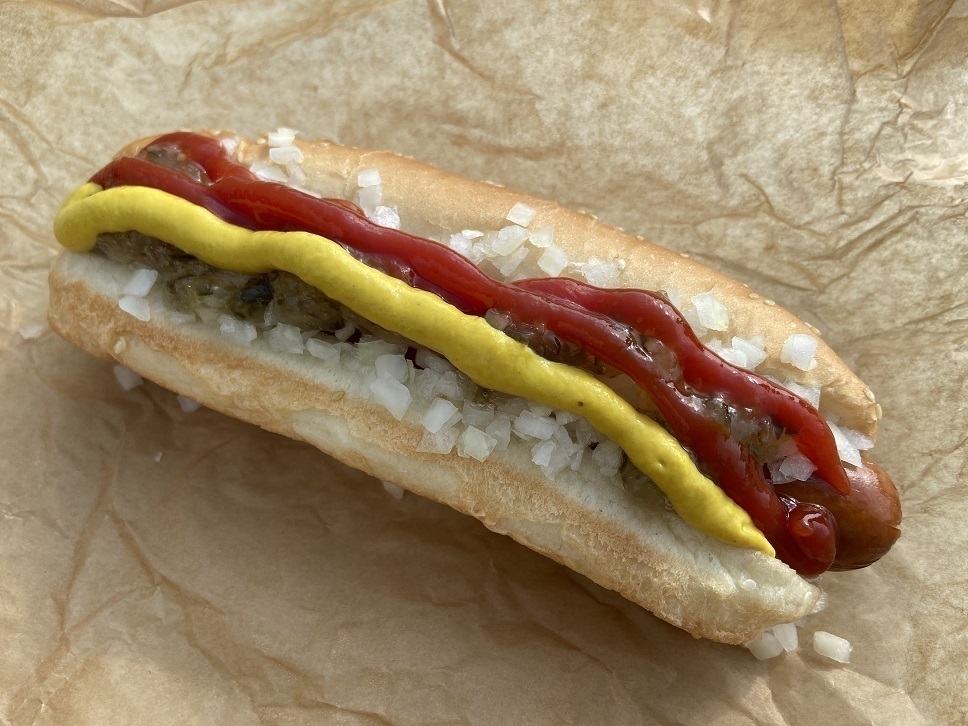 提供後はセルフゾーンにて、オニオン・レリッシュ・ケチャップ・マスタードをお好みでトッピングできます(乗せすぎにはご注意を!)。柔らかいパンは子供でも食べやすく、シャキシャキのオニオンが良いアクセント。