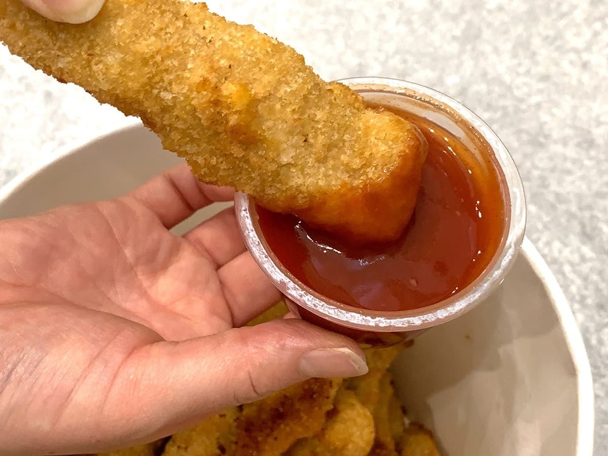 付属のチリソースをディップするとピリッと辛い刺激がクセになり止まらなくなりますが、辛めなのでお子さんや辛い物が苦手な方はご注意ください。
