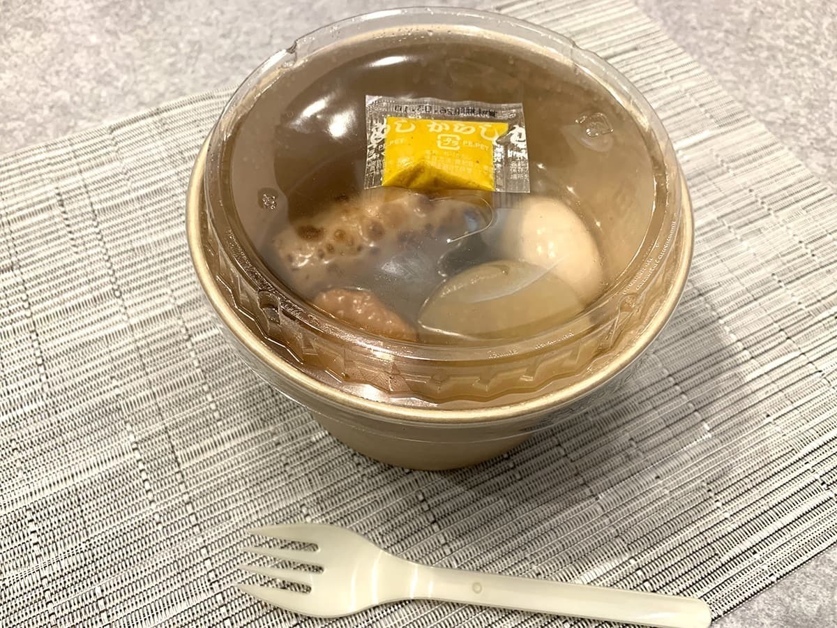 コストコのフードコートとしては珍しい日本食「おでん」をご紹介します。熱々の状態で提供されるため寒い季節にぴったりで、大きな容器の中には大根、ちくわ、たまご、さつま揚げ、こんにゃく、昆布の6種類の具材が入っています。