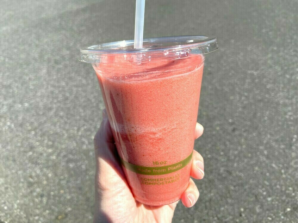 数ヶ月ごとにフレーバーが入れ替わる人気のスムージー。こちらは鮮やかなピンク色のいちご味です。