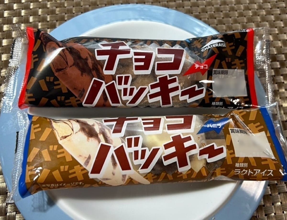 シャトレーゼアイスの代表格とも言える大人気商品「チョコバッキー」です。アイスの中には、まるで板チョコのようなスイートチョコレートが重なるように混ぜ込まれています。