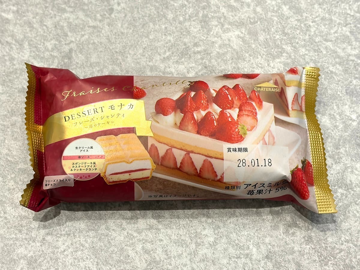 北海道産生クリームを使用した生クリームアイス、バニラビーンズ入りのカスタードアイス、苺ソース、そして苺チョコをモナカ皮でサンドした「DESSERTモナカ フレーズ・シャンティ」をご紹介します。