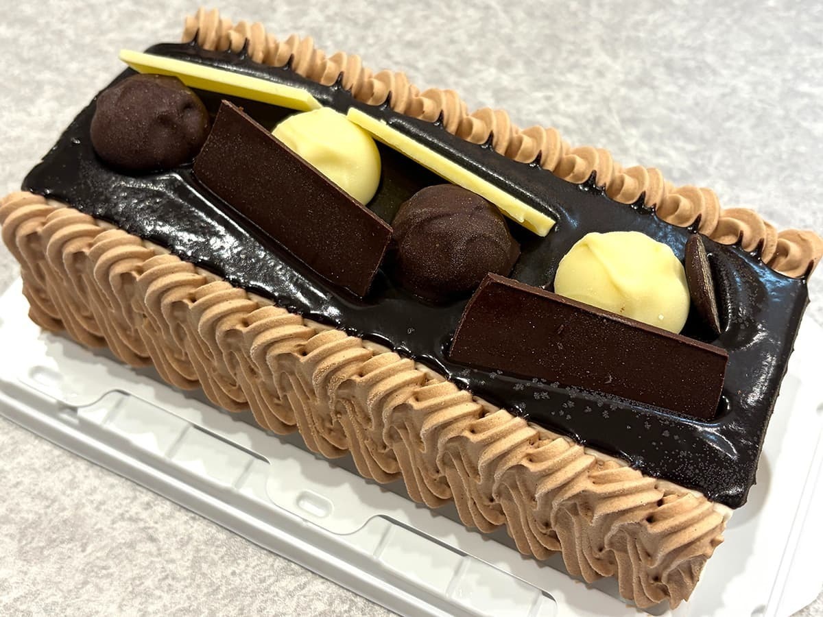 ケーキの上にはチョコソース、チョコプレート、トリュフチョコが乗っており、まさにチョコレート尽くしの仕上がりです。