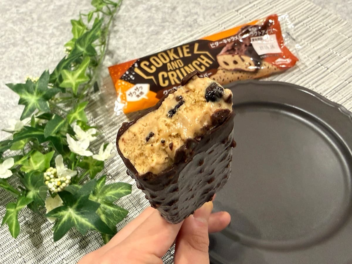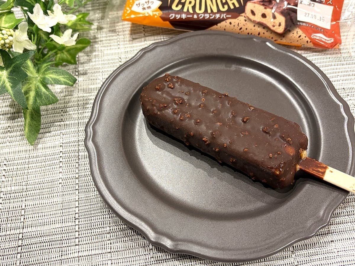 クッキーとクランチのカリカリ感、チョココーティングのパリッとした食感の違いがアイスの美味しさを引き立てており、100円以下ながらリッチで食べ応えのある仕上がりとなっています。