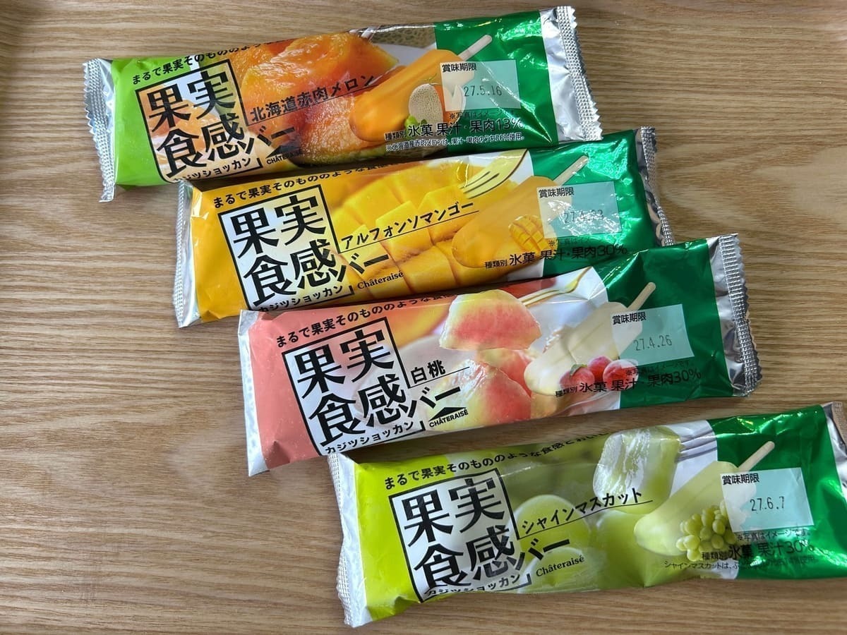 濃厚な果実感を体験できる、1本81円(税込)のアイスです。フレーバーは「北海道赤肉メロン」「シャインマスカット」に加え、季節限定の「アルフォンソマンゴー」「白桃」の全4種類があります。