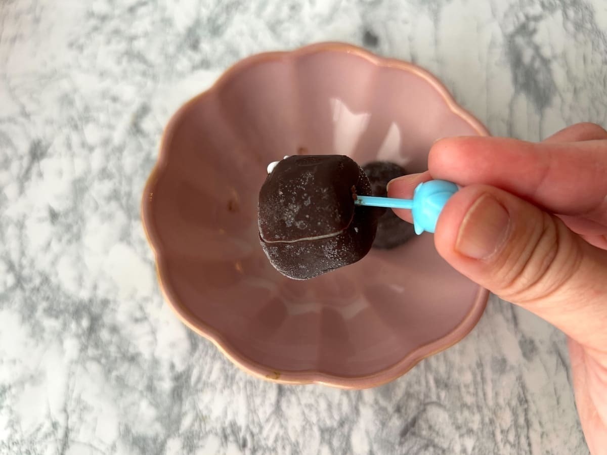 1個10mlというまさに一口サイズで、外側はチョコでコーティングされ、中にバニラアイスが入っています。バニラアイスは口溶けが良く非常に滑らかで、濃厚なミルクとバニラの風味が口いっぱいに広がります。
