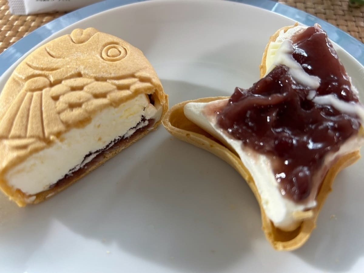 アイス、あんこ、モナカ皮それぞれの味わいのバランスを調整しつつ、食べやすい大きさに仕上げられています。中身を確認すると、しっぽの先までしっかりとあんとアイスが入っています。小豆の風味が豊かなつぶ餡とバニラアイスが溶け合い、最高の美味しさを楽しめます。