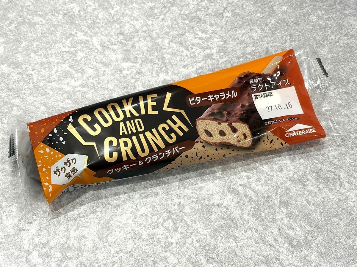 くどさを抑えた甘さが特徴の「クッキー&クランチバー ビターキャラメル」をご紹介します。ビターキャラメルアイスにブラックココアクッキーを混ぜ込み、さらにクッキークランチを散りばめたスイートチョコでコーティングした商品です。