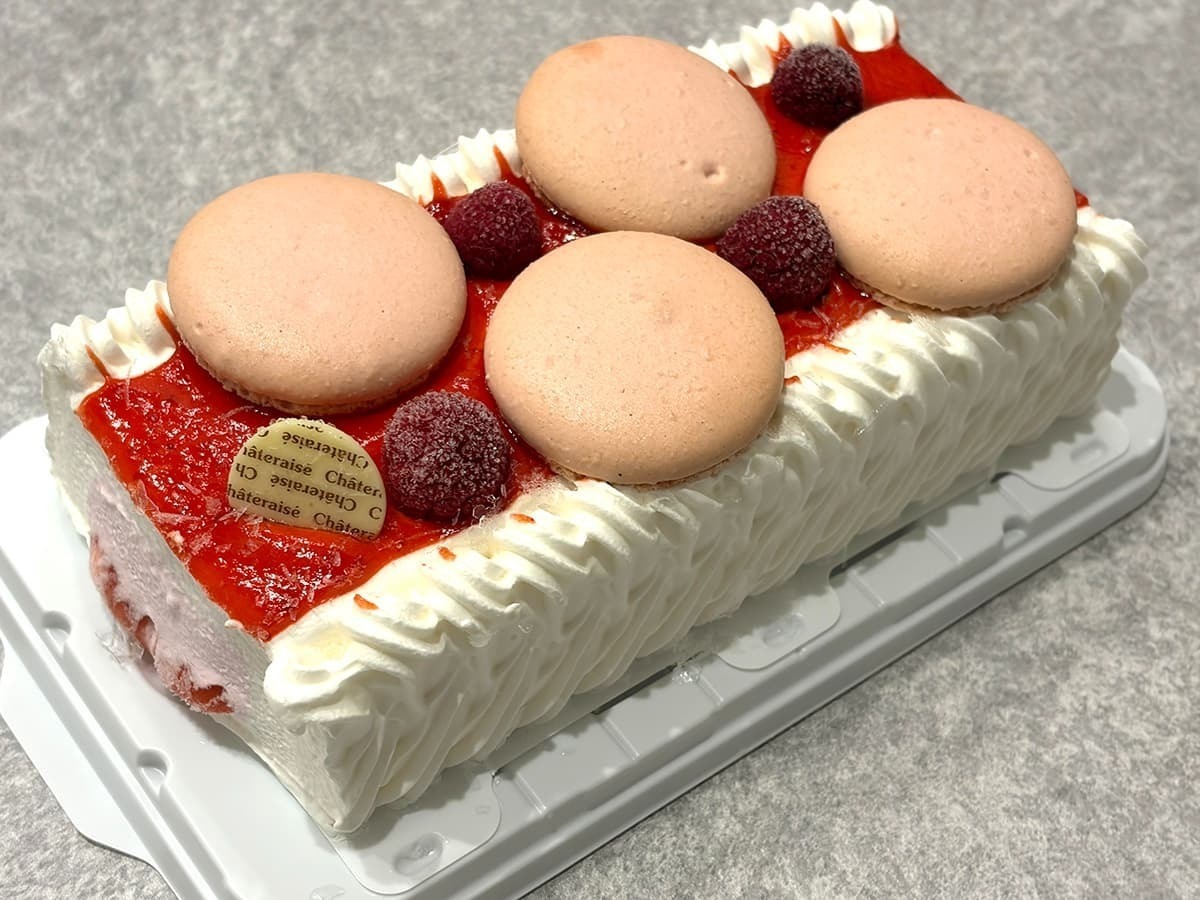 蓋を開けると赤と白のコントラストが美しいショートケーキのような配色で、上にはマカロンが豪快に乗っており、お祝い事にも適した贅沢感のあるビジュアルです。