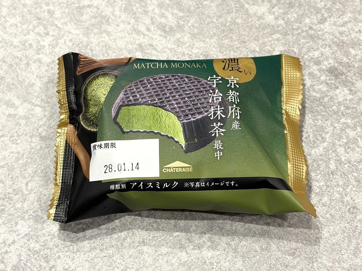 京都産の宇治抹茶を使用した「濃い京都府産宇治抹茶最中」をご紹介します。これはホワイトチョコでコーティングした宇治抹茶アイスを、竹炭入りの黒いモナカ皮でサンドした商品です。