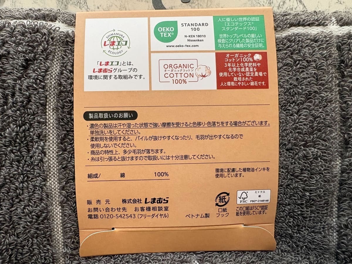 こちらも「エコテックススタンダード100」を取得しており、品質へのこだわりが感じられます。