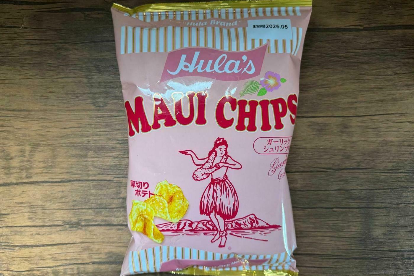 「マウイチップス」は、厚切りポテトを伝統的な釜揚げ製法で揚げた、ハワイで定番のポテトチップスです。しっかりとした歯ごたえがあり、じゃがいもそのものの濃厚な味わいを楽しめます。