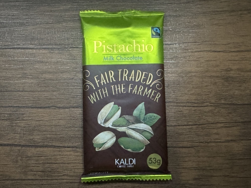 鮮やかな緑色のパッケージが目を引く、ピスタチオフレーバーのフェアトレードチョコレートをご紹介します。