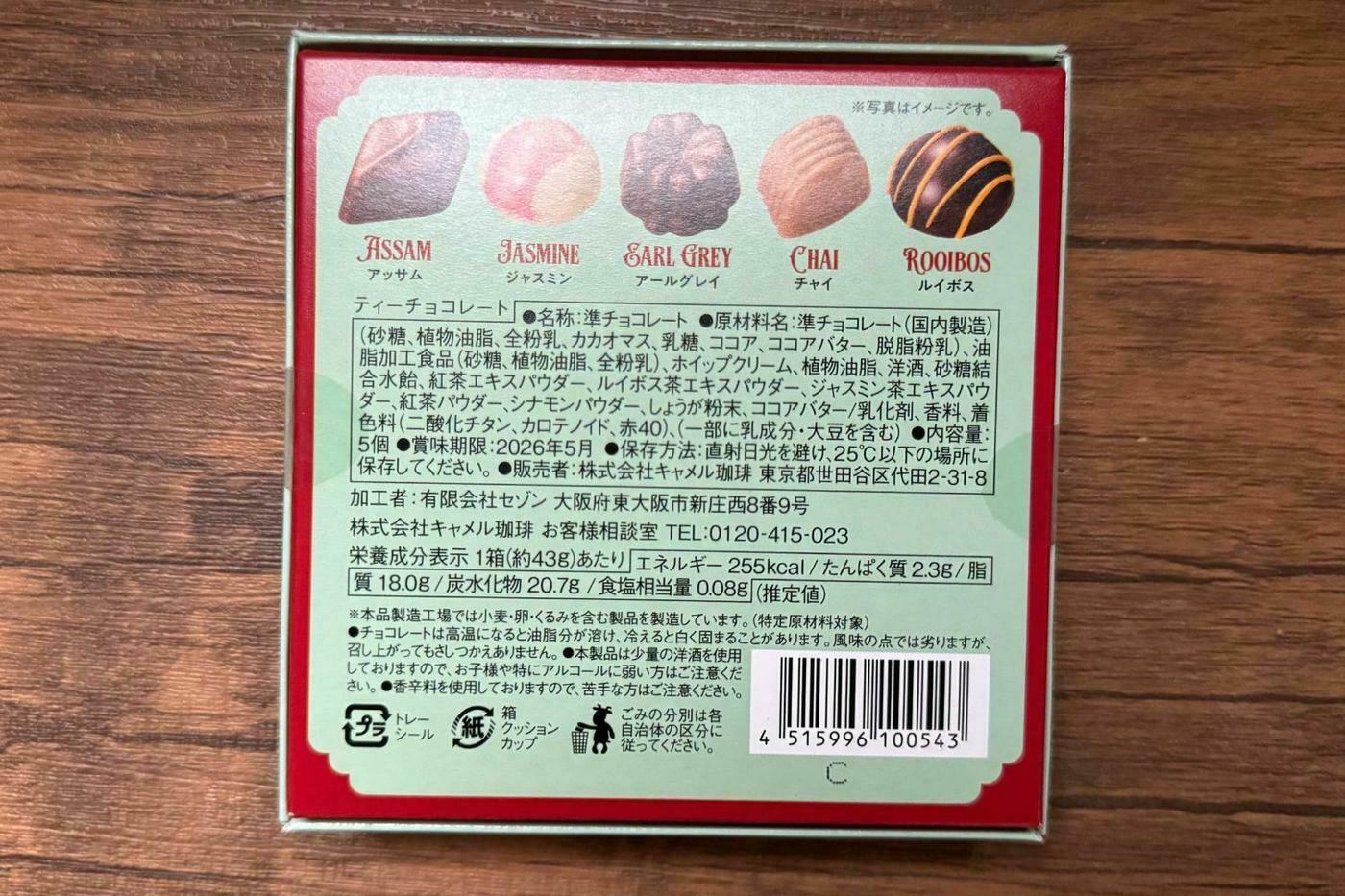 少しレトロな雰囲気が漂うパッケージが印象的な、5種類のティーチョコレートのアソートです。