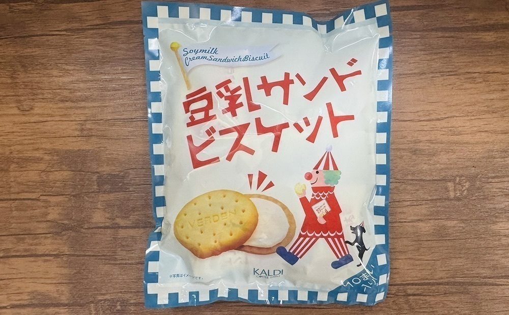 ピエロと黒い犬が描かれた可愛いパッケージが目印の、カルディオリジナル商品「豆乳サンド ビスケット」です。