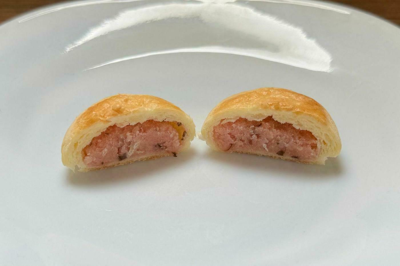 パイ生地を割ってみると、さくら色の白餡の中に桜の葉が入っているのが確認できます。ほんのりとさくらの風味が感じられ、しっとりとしたパイ生地は食べやすく、白餡との相性もバッチリです。一口サイズなので、パクパクと手軽に食べられます。