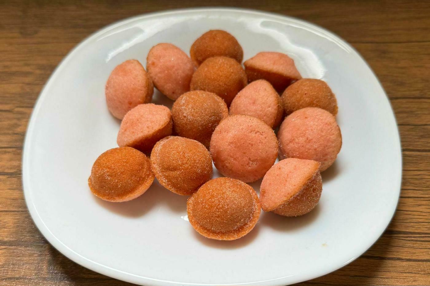 袋から取り出すと、コロッとした鈴カステラならではの形状と、さくら色と茶色の配色が可愛らしい見た目が楽しめます。実際に食べてみると、しっとりとした軽めの食感で甘さは控えめになっており、ほんのりと感じられるさくらの風味が良いアクセントになっています。