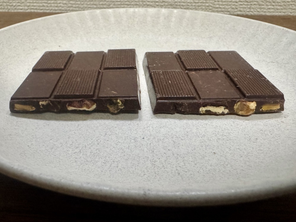板チョコの表面はプレーンですが、裏面にはピスタチオによる凹凸があり、割ってみると断面からもピスタチオが顔を出し、具材がしっかりと入っていることがわかります。