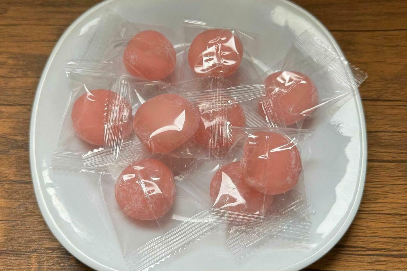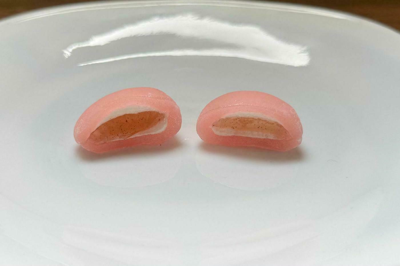 個包装されたさくら色のコロッとした形もかわいらしい一品です。実際に食べてみると、小ぶりながら想像以上にもっちりとした食感が特徴です。