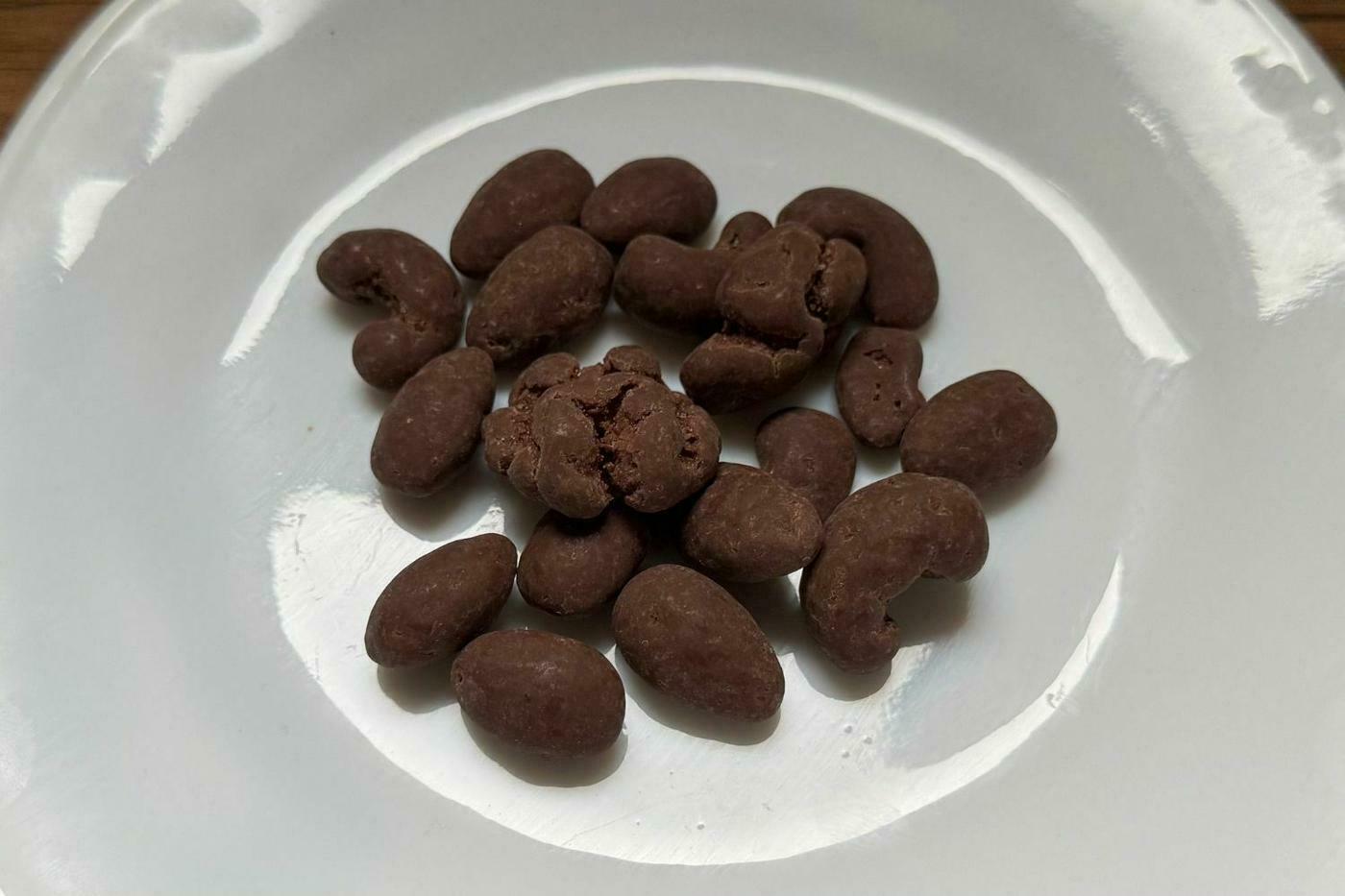 袋から取り出すと、チョコレートでコーティングされた真っ黒なナッツが現れます。実際に食べてみると、山桜チップによる燻製の効果でスモーキーなナッツの風味が口いっぱいに広がります。