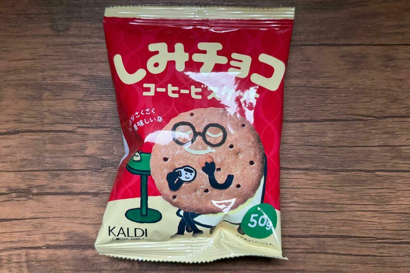 メガネのビスケットのキャラクターが特徴的な、カルディオリジナルの「しみチョココーヒービスケット」をご紹介します。