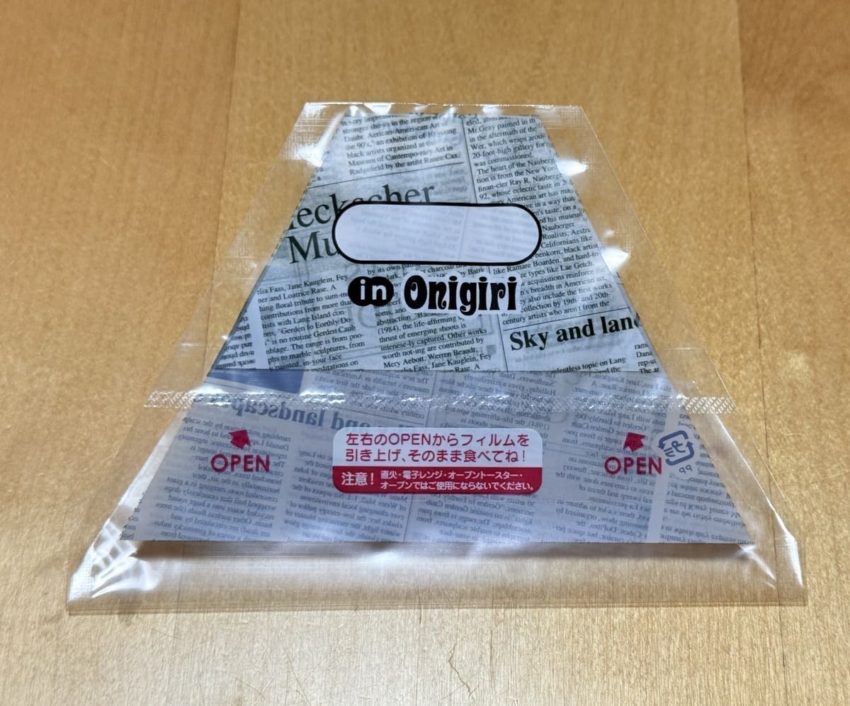 おにぎり中央部分に入った切れ目に沿って、左右のフィルムをぺろっと引き上げることで上部を開けることができ、下部分を手で持って食べるおにぎりフィルムです。