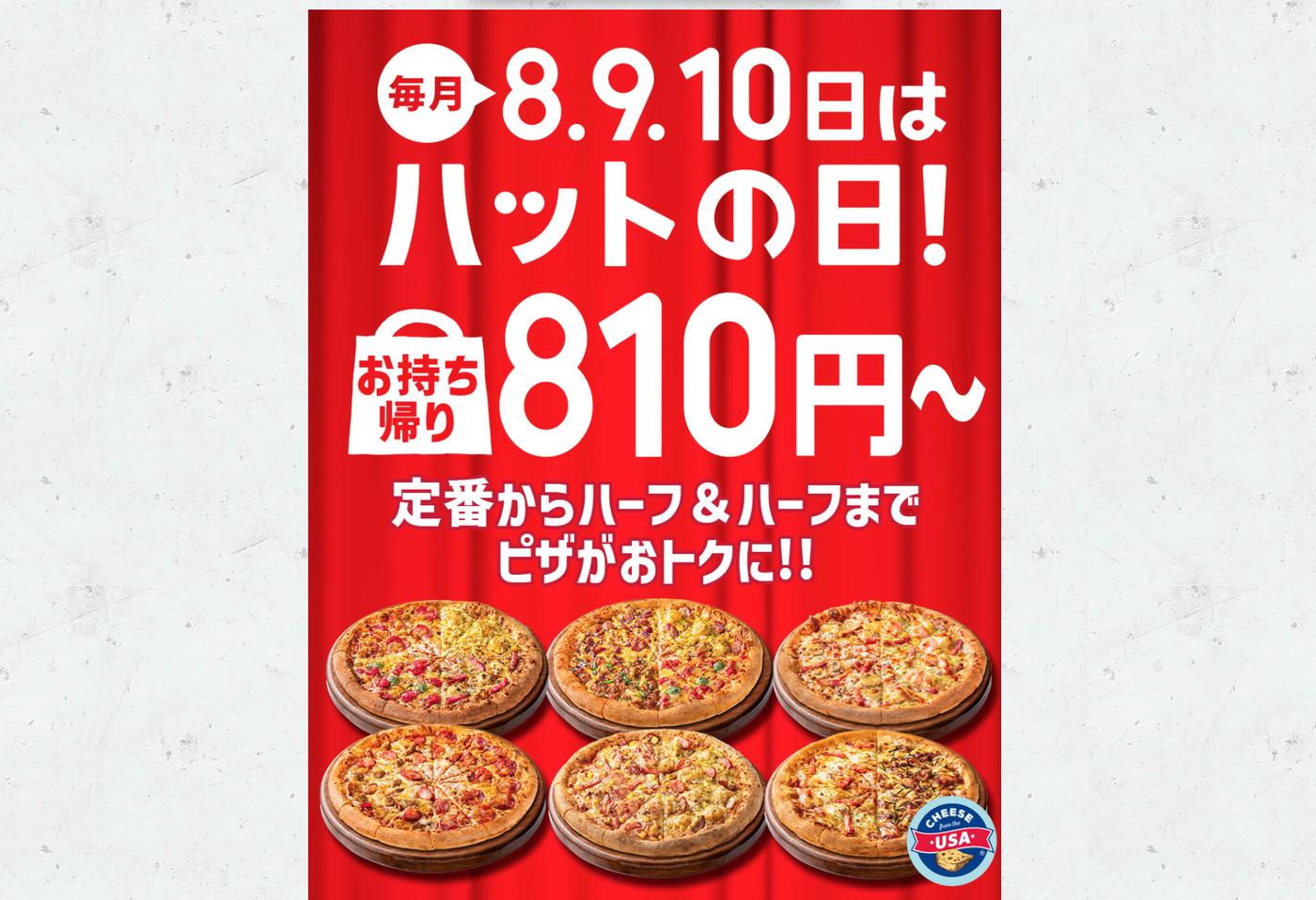 毎月「8(ハッ)」「10(ト)」にちなんだ、8日・9日・10日の3日間は、デリバリーピザチェーンのピザハットで開催される大人気イベント「ハットの日」です!