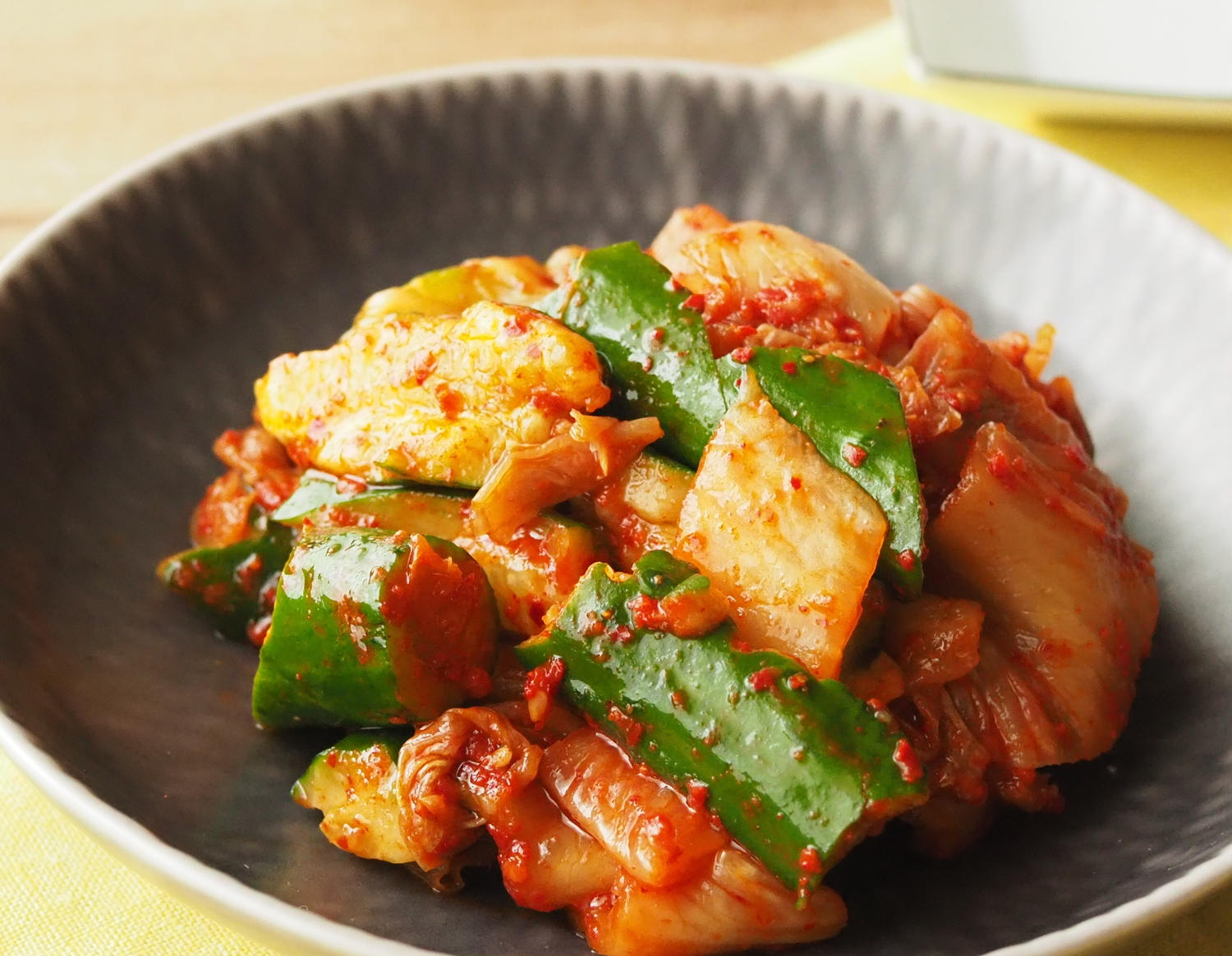 即席オイキムチ調理時間:5分((置いておく時間を含まない))材料2人分きゅうり1本白菜キムチ100g塩小さじ1/4ごま油小さじ2作り方1材料を切るきゅうりは麺棒でたたき、食べやすい大きさに切る。ポリ袋にきゅうりと塩を入れて和え、20分おく。キムチを食べやすい大きさに切る。2和えるきゅうりから出た水けを切り、すべての材料をボウルに入れて和える。