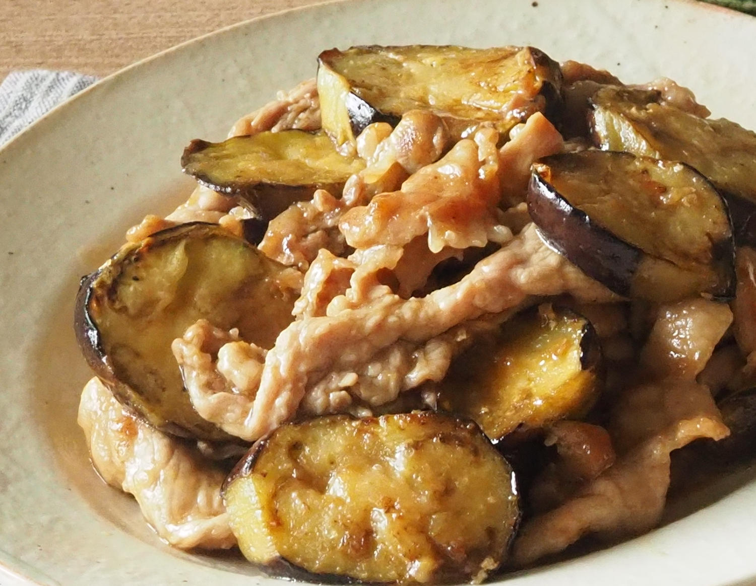 - 2焼くフライパンにサラダ油の3/4量を入れて中火にかけ、なすを両面に焼き色がつくまで焼く。いったん皿に取り出し、残りのサラダ油を入れて豚肉を色が変わるまで焼く。なすを戻し入れ、混ぜ合わせた調味料を回し入れたら、とろみがつくまで加熱する。