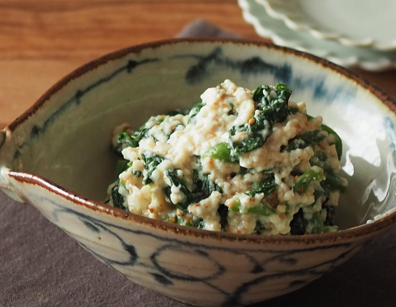 ほうれん草の白和え調理時間:15分材料2人分ほうれん草1束(200g)豆腐(木綿)1/2丁(150g)○白だし(2倍濃縮)大さじ1と1/2○白すりごま大さじ2○砂糖小さじ1と1/2作り方1材料を切るほうれん草は塩ゆでして冷水にさらし、3cmの長さに切ってしっかり水けを絞る。豆腐はペーパータオルに包んで耐熱皿にのせ、600Wの電子レンジで2分加熱する。2和えるボウルに豆腐を入れて泡立て器でつぶし、○を加える。ほうれん草を入れて和える。