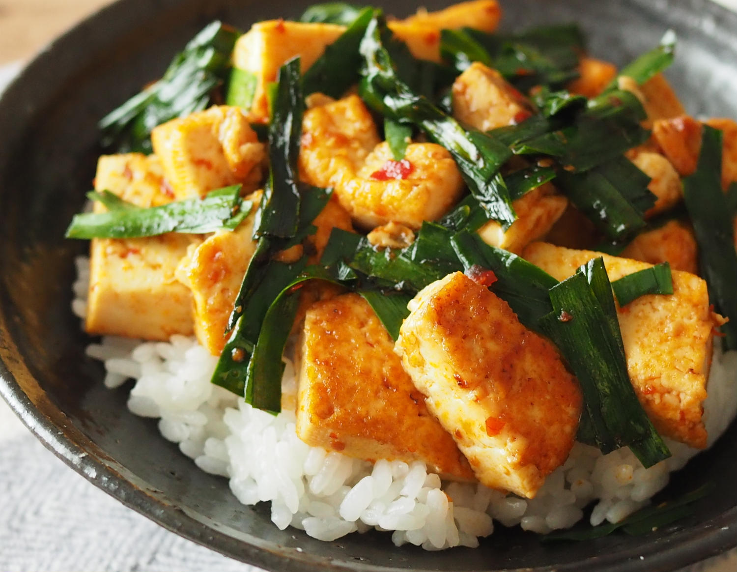 豆腐とニラのピリ辛丼