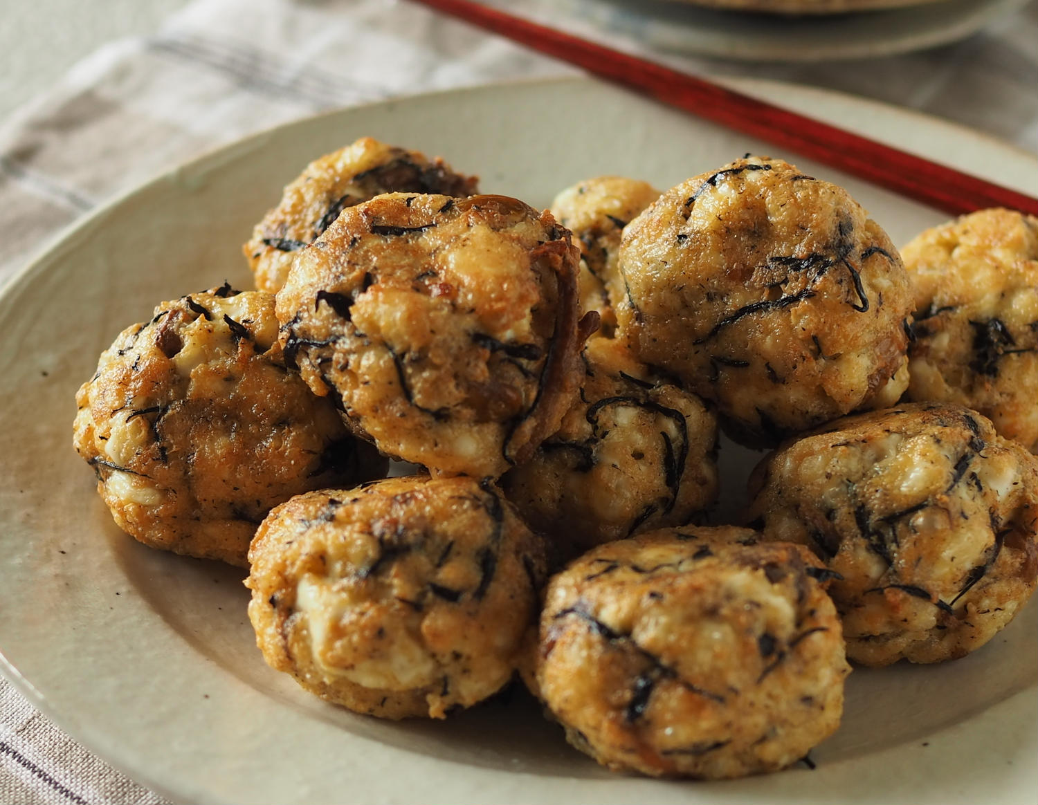 ひじきがんも調理時間:20分((豆腐の水切り時間を含まない))材料作りやすい分量もめん豆腐1丁(350g)ひじき煮100g○卵1個○片栗粉大さじ1○しょうゆ小さじ1揚げ油適量作り方1豆腐の水切りをする豆腐はペーパータオルに包んで上から重石をのせ、250gになるまで水切りする。2混ぜるひじき煮をペーパータオルで包んで汁けを軽く絞る。ボウルに豆腐、ひじき、○を入れて手でよく混ぜる、10等分して丸める。3揚げる揚げ油を170℃に熱し、2をきつね色になるまで揚げる。