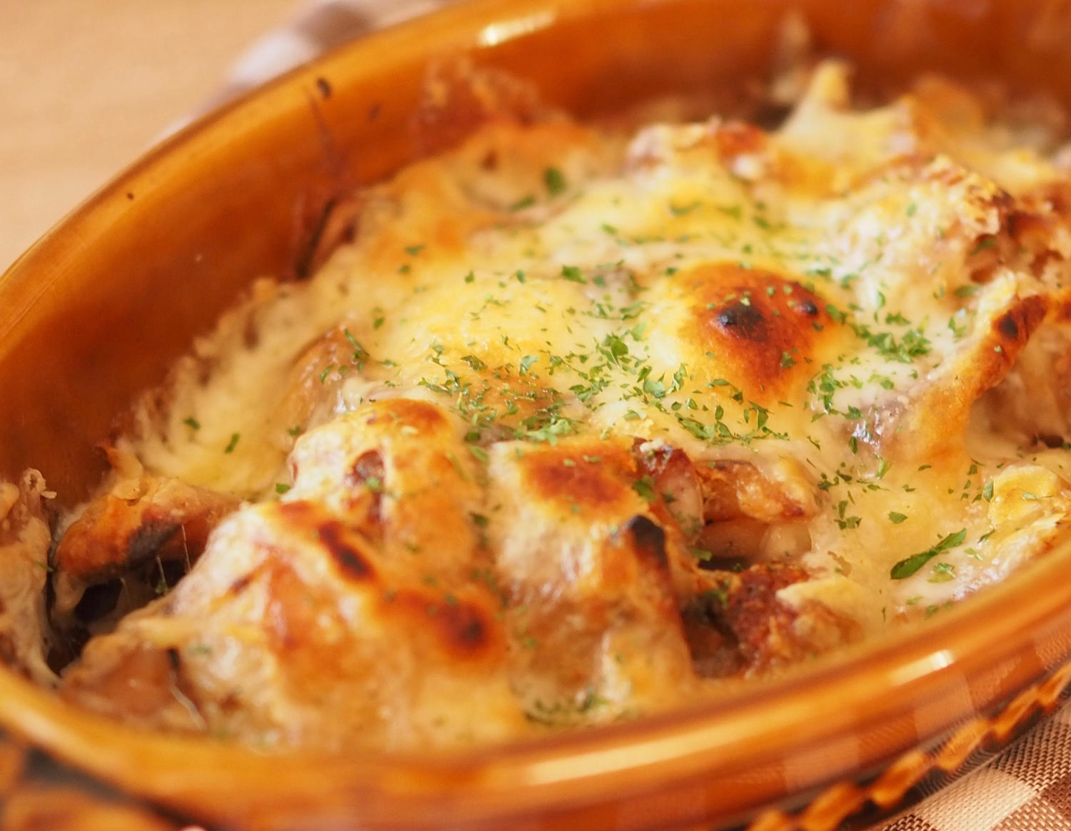 - 3焼く2を耐熱皿に入れてチーズをのせ、750Wのトースターで焼き色がつくまで焼く(目安:7分程度)。仕上げにドライパセリを散らす。