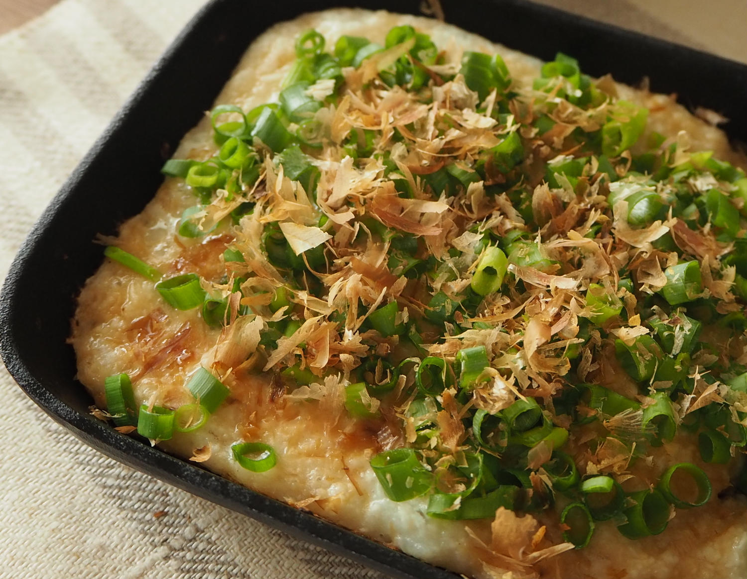 - 2焼くスキレットや直火にかけられる器にサラダ油を入れて中火にかけ、豆腐を両面焼き色がつくまで焼く。豆腐の上に山芋を流し入れ、弱火にして5分焼く。